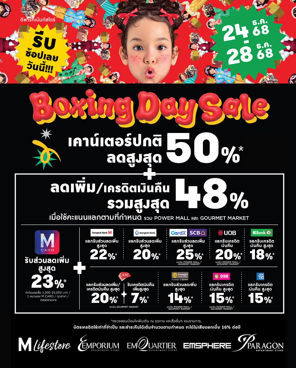 เงื่อนไขรวม : เฉพาะสินค้าที่ร่วมรายการ ยกเว้น Gourmet Eats, สุรา/Wine Cellar, บัตรกำนัล, บัตรของขวัญ, บัตรเติมเงินทุกประเภท,ยา,นมผงทารกและเด็กเล็ก สูตร 1 และสูตร 2, ร้านค้าเช่าภายในห้างฯ และศูนย์ฯ โดยมียอดใช้จ่ายจากบัตรเครดิตภายใต้ชื่อ-สกุลเดียวกัน และ/หรือ หมายเลขบัตรเดียวกัน ภายในวันและสาขาเดียวกัน ขอสงวนสิทธิ์ในการเปลี่ยนแปลงสิทธิประโยชน์สำหรับการมอบส่วนลด/เครดิตเงินคืน ทั้งนี้อาจมีการเปลี่ยนแปลงเงื่อนไข ข้อกำหนด โดยจะแจ้งให้ทราบล่วงหน้า ส่วนลด/เครดิตเงินคืนมีจำนวนจำกัด และไม่สามารถแลกเปลี่ยนเป็นเงินสดได้ เครดิตเงินคืน/คะแนนสะสมไม่สามารถโอนย้ายสิทธิหรือเปลี่ยนแปลงเป็นเงินสดได้ คะแนนสะสมที่ถูกแลกเป็นส่วนลดเพิ่ม/เครดิตเงินคืนแล้วไม่สามารถยกเลิก หรือขอคืน หรือทอนเป็นเงินสด หรือสิ่งอื่นได้ทุกกรณี โดยสมาชิกบัตรเครดิตจะต้องคงสภาพสมาชิกบัตรเครดิตและไม่ได้ผิดนัดชำระเงินใดๆ จนถึงวันที่ทำการโอนเครดิตเงินคืน/คะแนนสะสมเข้าบัญชี ใบเสร็จที่ใช้ร่วมรับสิทธิประโยชน์ของรายการแล้วไม่สามารถนำมารับสิทธิประโยชน์อื่นๆของทางบัตรเครดิตได้อีก ขอสงวนสิทธิ์ในการเรียกคืนสิทธิประโยชน์ต่างๆ ในกรณีที่มีการคืนสินค้า/บริการในภายหลัง ขอสงวนสิทธิ์เฉพาะบัตรที่ออกในประเทศไทยเท่านั้น ขอสงวนสิทธิ์เฉพาะลูกค้าปลีกเท่านั้น ข้อกำหนด เงื่อนไขและระยะเวลาเป็นไปตามของแต่ละธนาคารกำหนด ขอสงวนสิทธิ์ในการพิจารณาตัดสินข้อโต้แย้งหรือข้อพิพาทใดๆ ที่เกี่ยวข้องกับรายการส่งเสริมการขายนี้