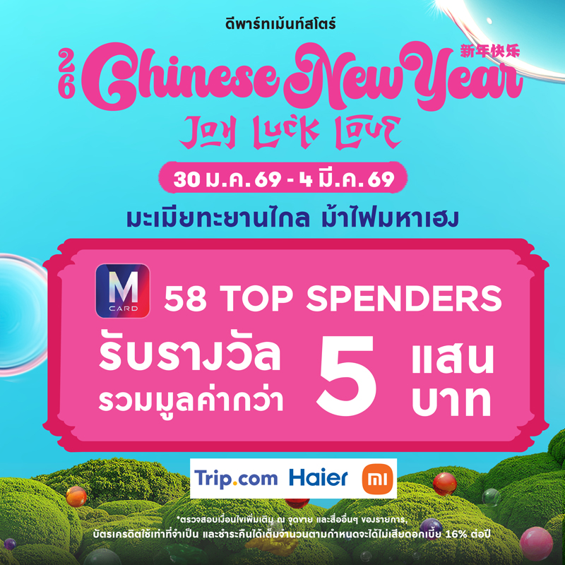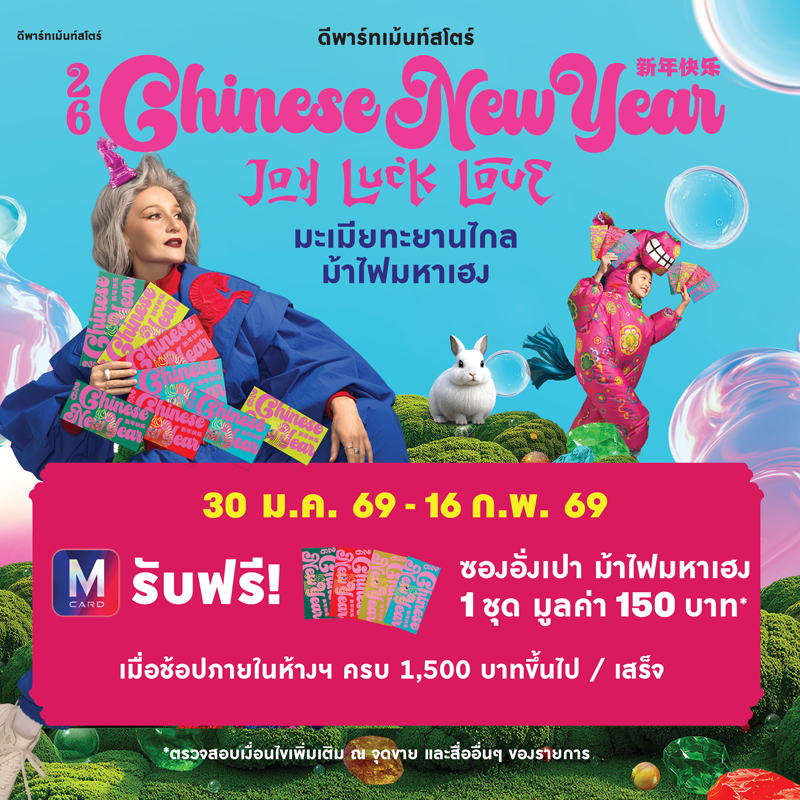 สมาชิก M CARD รับฟรี! ซองอั่งเปามหาเฮง 1 ชุด (4 ซอง) มูลค่า 150 บาท ช้อปภายในห้างฯ ครบ 1,500 บาทขึ้นไป / ใบเสร็จ (รวม POWER MALL และ GOURMET MARKET)