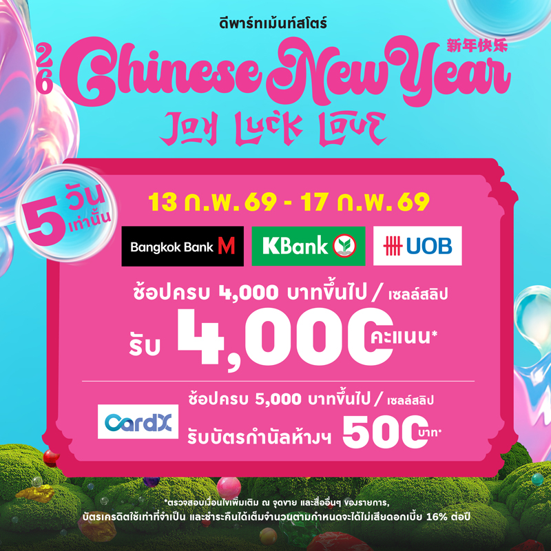 *เฉพาะสินค้าและสาขที่ร่วมรายการ, จำกัดจำนวนและยอดซื้อ, เงื่อนไขเป็นไปตามที่ห้างฯ และธนาคารกำหนด, ตรวจสอบเงื่อนไขเพิ่มเติม ณ จุดขาย, บัตรเครดิตใช้เท่าที่จำเป็นและชำระคืนได้เต็มจำนวนตามกำหนด จะได้ไม่เสียดอกเบี้ย 16% ต่อปี, สินเชื่อส่วนบุคคลกู้เท่าที่จำเป็นและชำระคืนได้ตามกำหนด จะได้ไม่เสียดอกเบี้ย 25% ต่อปี