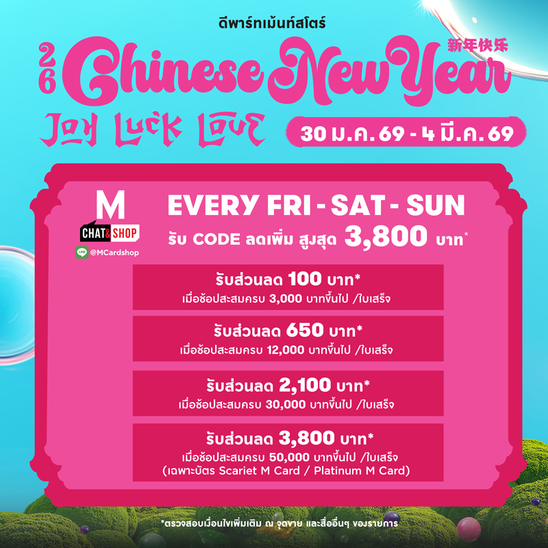 - Code ลดเพิ่ม ช่องทาง M Chat & Shop สามารถใช้ได้ระหว่างวันที่ 30 มกราคม 2569 – 1 กุมภาพันธ์ 2569 / 6-8 กุมภาพันธ์ 2569 / 13-15 กุมภาพันธ์ 2569 / 20-22 กุมภาพันธ์ 2569 / 27 กุมภาพันธ์ 2568 – 1 มีนาคม 2569 (15 วัน)