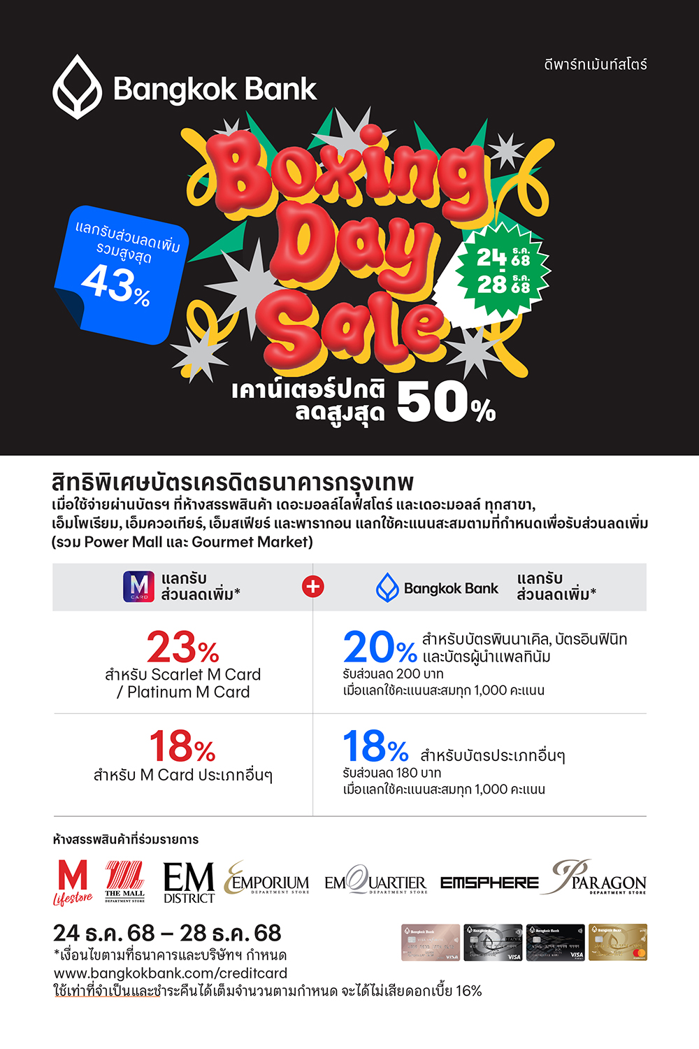 • สิทธิพิเศษบัตรเครดิตธนาคารกรุงเทพที่มียอดใช้จ่ายผ่านบัตร เฉพาะชำระเต็มจำนวน (ไม่รวมรายการแบ่งชำระ) ที่ห้างสรรพสินค้าเดอะมอลล์ ไลฟ์สโตร์ และ เดอะมอลล์ ทุกสาขา, เอ็มโพเรียม, เอ็มควอเทียร์, เอ็มสเฟียร์ และ พารากอน ยกเว้น การซื้อสินค้าประเภทบัตรกำนัล, สุรา/Wine Cellar, ยา, นมผงทารก และเด็กเล็ก สูตร 1 และ สูตร 2, Gourmet Eats, Food Hall, Take Home, บัตรเติมเงินทุกประเภท, สินค้าที่ไม่ร่วมรายการ, การมัดจำสินค้าไม่เต็มจำนวน, ร้านค้าเช่าภายในห้างฯ, และศูนย์การค้า