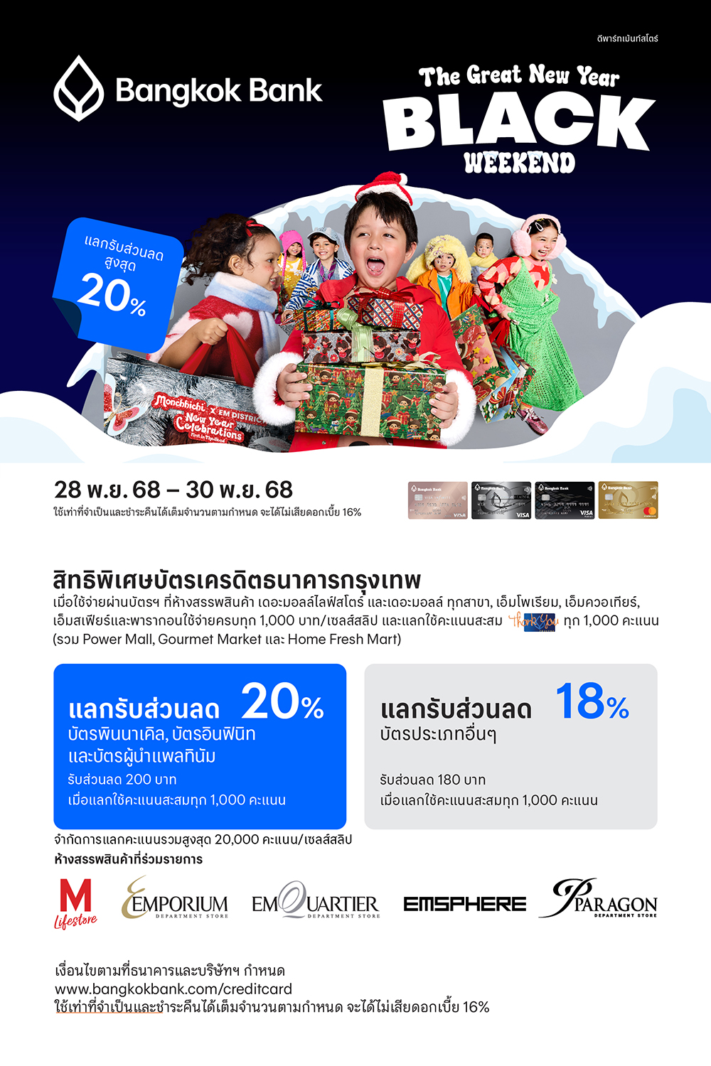 - บัตรเครดิตธนาคารกรุงเทพ (BBL) : แลกรับส่วนลดเพิ่มสูงสุด 20%