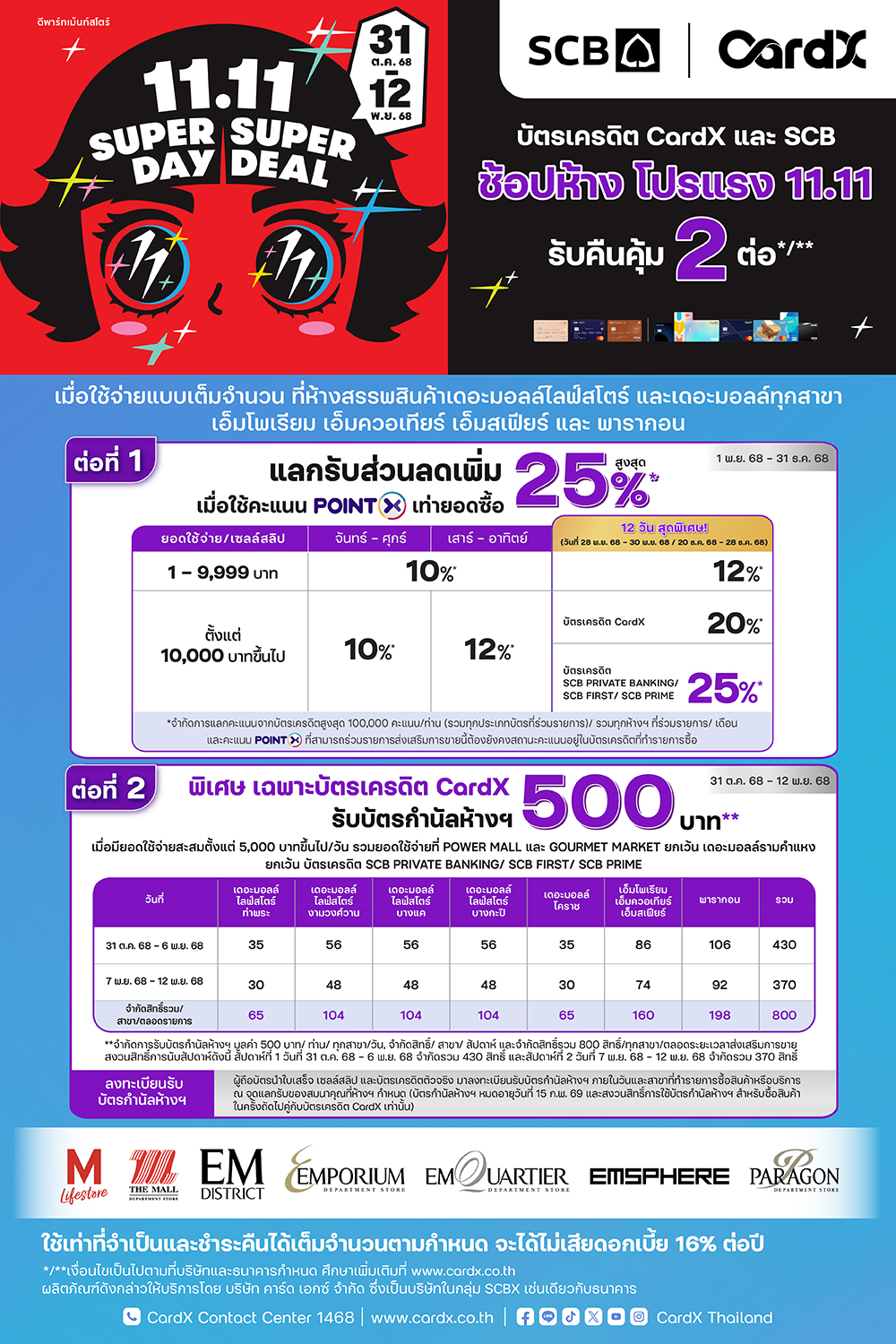 บัตรเครดิต CardX และบัตรเครดิต SCB : แลกรับส่วนลดเพิ่มสูงสุด 25% + รับบัตรกำนัลห้างฯ 500 บาท